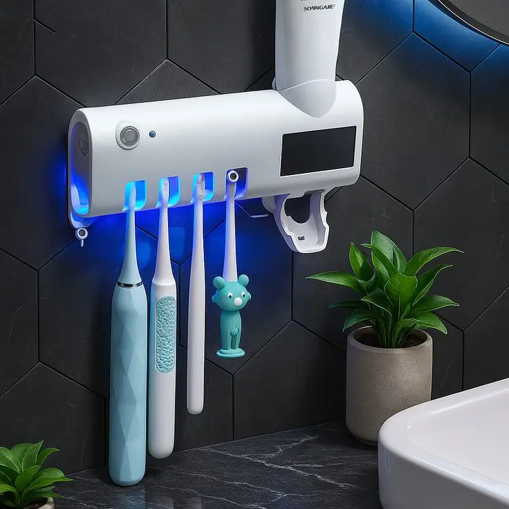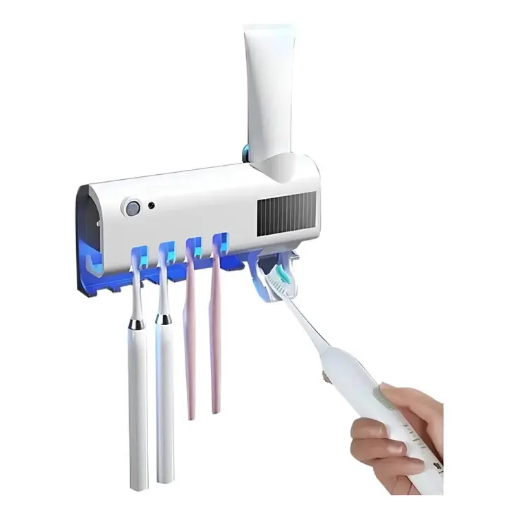 Higiene superior y orden total para tu baño. Este dispositivo inteligente no solo organiza tus cepillos, sino que utiliza tecnología de luz UV para eliminar hasta el 99.9% de bacterias y gérmenes. Además, incluye un dispenser automático de pasta dental para aprovechar cada pomo al máximo, todo sin necesidad de perforar la pared.