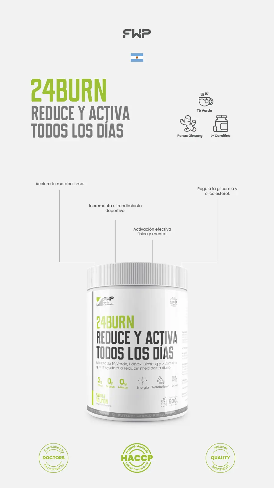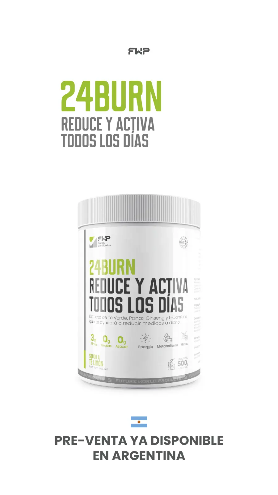 FWP 24BURN es el aliado ideal para quienes quieren acelerar su metabolismo, quemar grasa y reducir medidas de forma natural. Su fórmula avanzada combina ingredientes reconocidos como té verde, Panax Ginseng y L-Carnitina, que ayudan a potenciar la quema de grasa y aumentar la energía durante el día.